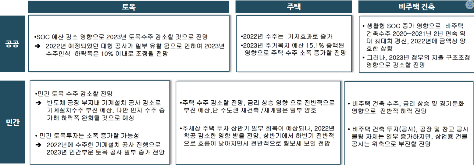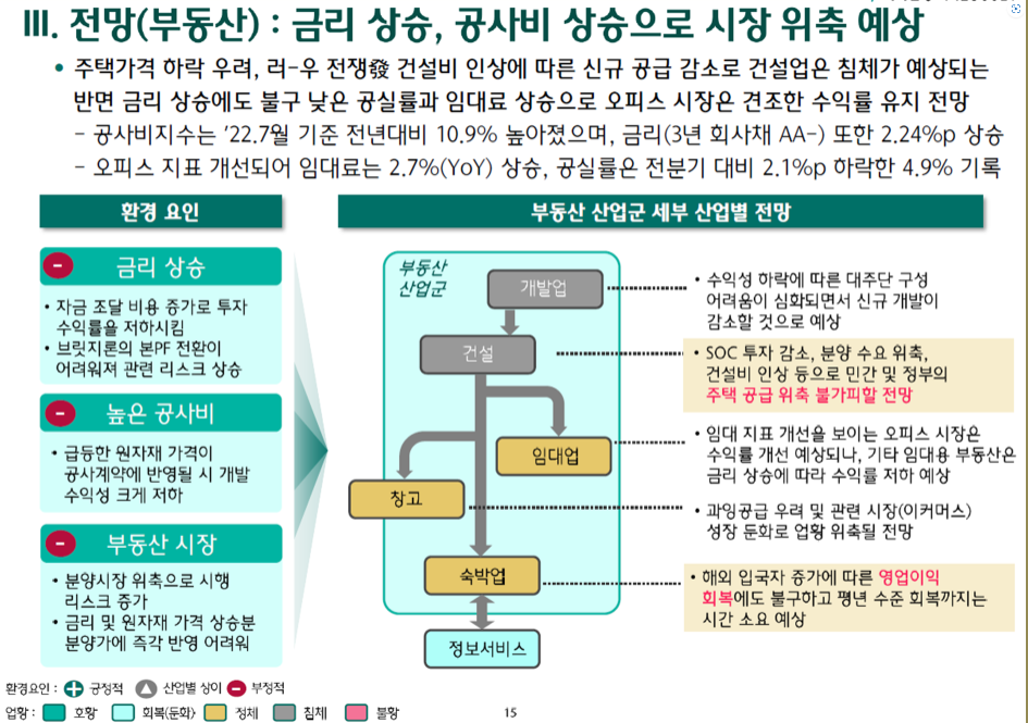 - 시행사, 건설사, 건설 하청업자 등과 과도한 PF 대출 및 관련 채무보증에 나셨던 제2금융권 금융기관의 연쇄 부실 가능성에 대비하여 사업장별로 다각도의 부실평가 및 자금조달 계획 등을 꼼꼼히 살펴볼 필요