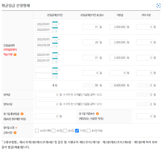 근무 기간이 3개월 미만인 경우 1일 통상임금을 작성해야 합니다.
